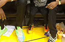 在今天上午结束的2014新秀赛上,凯尔特人队新秀凯利-奥利尼克穿着了一双非常特别的Nike KD VIBig Game Hunter定制鞋款。绿色鞋身呈现出独特的金属光泽,辅以橙色细节及蓝色大底,令球鞋