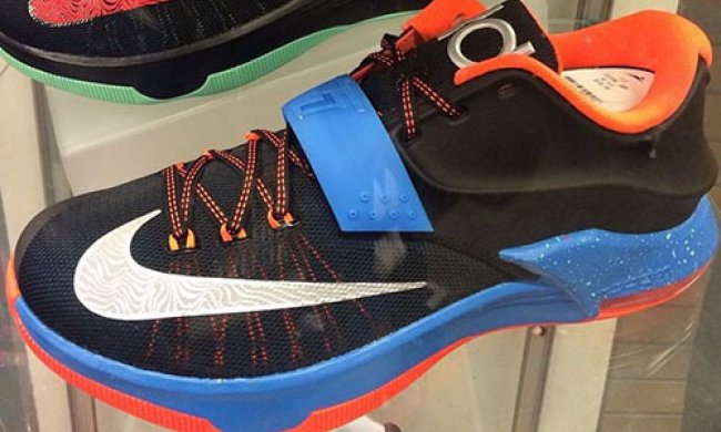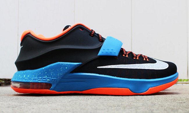 虽然没有成为Nike KD 7 首发配色,但雷霆客场配色自曝光以来还是受到了众多球迷的关注。这款配色将以黑色作为主色调,并搭配蓝色中底及魔术贴,醒目的橙色则点缀外底与内衬。这款