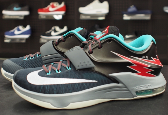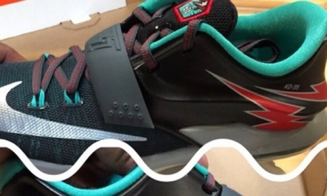 GS 女款的 KD7 曝光新款配色,采用深色主色调点缀水绿色和红色细节,Posite 材质部分以红色的闪电图纹呈现,鞋舌带有特别的标志,鞋身上带有 KD-35 字样,目前尚无更多的信息和发售日