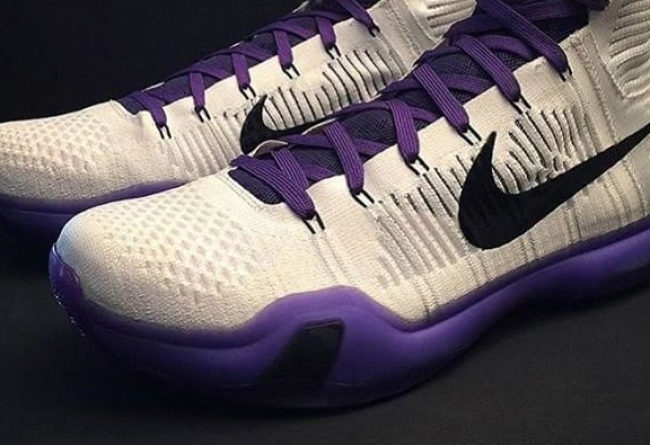 一款湖人队主场配色的 Kobe 10 Elite PE 鞋款亮相网络,将紫金军团的经典装扮在高帮鞋型上完美呈现,紫色 Flyknit 编织鞋面,点缀黄色的 Swoosh、鞋带和大底,同湖人队球服颇为搭配。