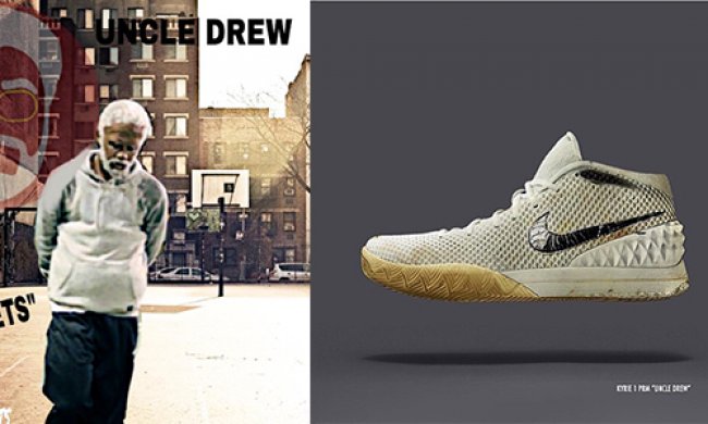 以欧文为百事可乐拍摄的经典广告为灵感,以片中欧文所扮演的 Uncle Drew 德鲁大叔为主题,在Nike Kyrie 1 鞋身上以泛黄的鞋身呈现。整体的做旧感受颇为特别。