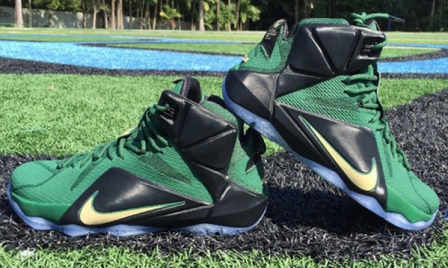 继 SVSM 主场配色登陆 LeBron 12 之后,一款 SVSM Away 客场配色的 LeBron 12 PE 也曝光了实物图片。以标志性的绿色搭配黑色打造鞋身,点缀金色的 Swoosh 和 LBJ Logo,蓝水晶大底的托衬恰当好处