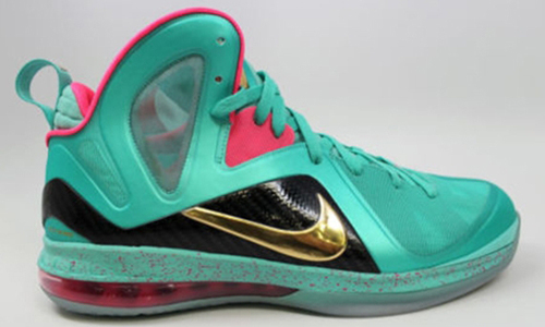 同样以水蓝色辅以金色点缀,不过鞋身内衬/中底泼墨/Max Air等细节的粉色装饰让这款同样刻有MVP logo的未市售Nike LeBron 9 PS Elite样品充满了南海岸风情。与自由女神像别注一样,也是超罕