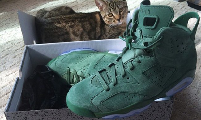 近日说唱歌手Macklemore通过自己的instagram账号展示了他的猫咪Cairo新入手的球鞋,一款首次曝光的全新Air Jordan 6 Retro。此双Air Jordan 6选用绿色优质麂皮制作鞋身,搭配同色调防水鞋带以及