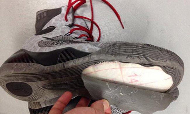 开拓者后卫马休斯在近期的 NBA 赛场上经常穿着 Nike Kobe 9 Elite 出战,不知是否是他太过努力,沉浸于场上厮杀,他的一双 Kobe 9 Elite 战靴居然遭遇了破底局面。 XDR 大底的前掌大面积开裂