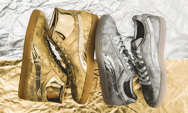 带来更多关于 Meek Mill xPUMA Suede 24K White Gold 白金系列的实物图赏。分别以贵金属金色和银色打造,在PUMA Suede 经典的麂皮鞋身上奢华呈现。