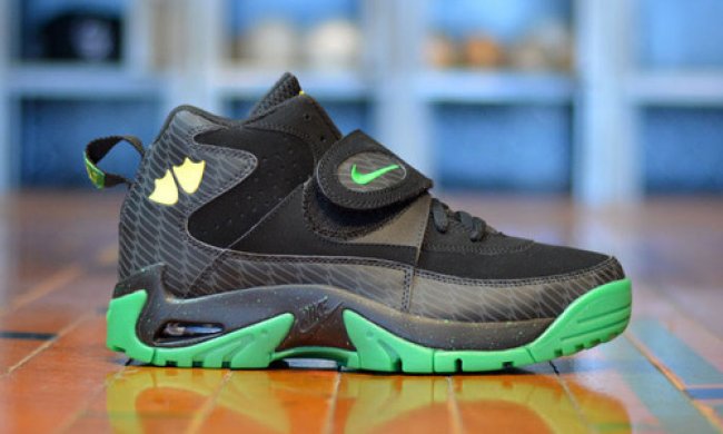 俄勒冈的球员们曾在1994年的玫瑰杯以及Pac-10冠军赛中着用过Nike Air Mission,时至今日终于能够拥有鸭队专属版本。黑色牛巴革搭配印有鸭羽纹理的人造革制作,细节装饰苹果绿,后跟鞋