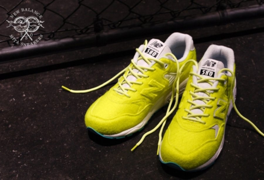 mita sneakers联手New Balance打造全新MRT580,名为The Battle Surfaces。绒质荧光色鞋身搭配白色内衬、鞋舌、中底,再配以蓝色鞋垫以及草绿色大底,鞋垫印有铁网图案,整体呈现出网球以及网球