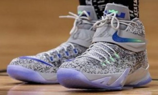 Nerlens Noel 上脚Nike Soldier 8 PE 明日之星配色,在灰色鞋面上呈现出全明星纹理图案,细节采用蓝绿渐变色点缀。