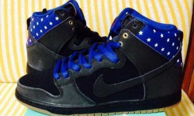 眼前这款全新Nike SB Dunk High之前已有实物曝光,黑色鞋身颇为低调,蓝色鞋领部分附有白色星星点缀呈现星条旗的错觉,鞋垫则真正以星条旗为灵感设计。亚洲部分地区已率先提前发售