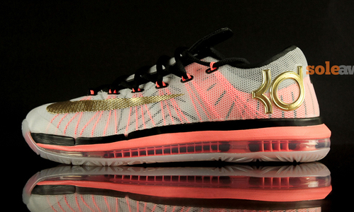 看过实物后段局部预览之后,为EYBL青年精英篮球联赛特别准备的Nike KD 6 Elite PE终于呈现完整实物。鞋款选用紫色搭配橙色,网面织物鞋身以渐变效果装饰,内衬附有类似花卉纹理点缀。