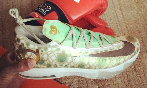 继Nike KD 4上首次呈现后,KD 6再度打造别注版本向Kevin Durant的母亲Wanda Pratt致敬。淡色调鞋身印有翡翠饰品图案装饰,细节点缀金色并在鞋舌附上Wanda Pratt的心形logo。此款Nike KD 6暂时没有