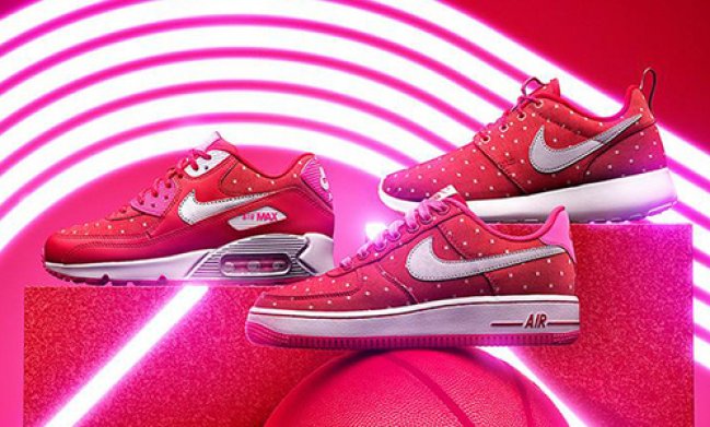 Nike Sportswear 带来为 2015 情人节所打造的特别鞋款。在女款 NIke Air Max 90、Nike Air Force 1 以及 Nike Roshe Run 鞋型上采用红色鞋面搭配粉色细节,以波点风格呈现。 现已登陆 NSW 店铺上架发售