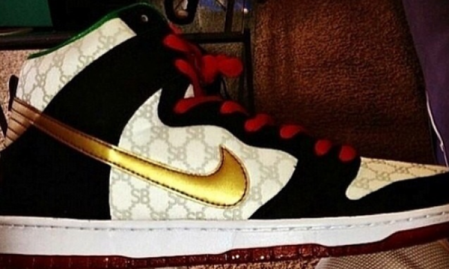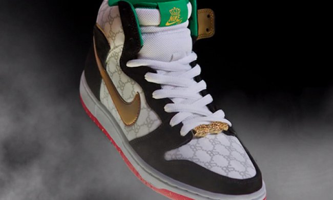 黑色麂皮搭配印有Gucci风格纹理灰色SB字样的白色织物,配上金色swoosh/后跟、绿色内衬、红色鞋带以及附有金色亮片装饰的红色大底,此双由Black Sheep联手Nike SB打造的全新Nike SB Dunk Hig
