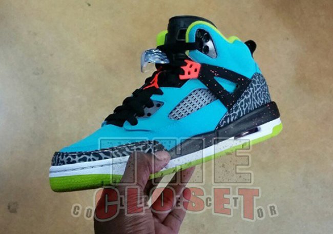 近日网络上出现了一双全新配色的Jordan Spizike :鞋面由醒目的湖蓝色呈现,并搭配同样耀眼的荧光绿外底与内衬。带有白色泼墨效果的黑色中底与TPU装饰点缀鞋身之上,搭配上白色中底