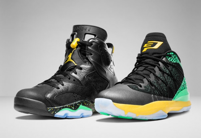 以主办国巴西为配色灵感,Jordan Brand 为庆祝 FIFA 世界杯开幕而特别呈上 Brazil Pack。套装包含一双 Air Jordan 6 以及一双 CP3.VII AE,均以黑色作为鞋身主色调辅以绿色以及黄色装饰,再配上