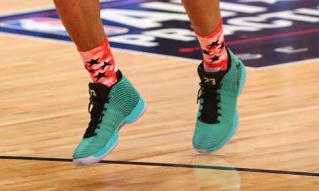 威斯布鲁克在全明星正赛前的热身训练中穿着了一款全新的Air Jordan XX9 PE。由水蓝色鞋面搭配蓝水晶大底,鞋面覆盖黑色波纹纹理。