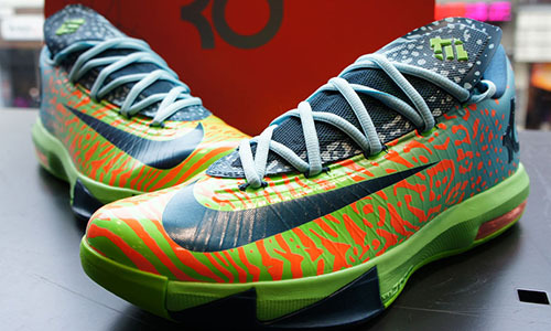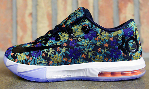 Nike KD VI花卉帆布配色,再度曝光实物照片。充满热带风情的花纹纹理鞋面搭配水晶大底,并辅以黑色内衬及Swoosh,令鞋款极具特色。此鞋款尚无任何发售信息,感兴趣的朋友请关注我们