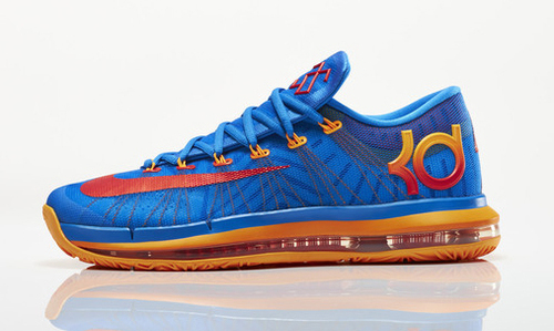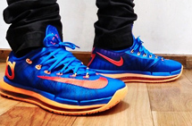 网上曝光之前Kevin Durant已有亲着示范的蓝/橙色KD 6 Elite的实物照,蓝色鞋身配以黄色以及橙红色点缀,后跟KD logo以渐变效果呈现,而全掌可视化气垫则诱人不禁想穿上试试。