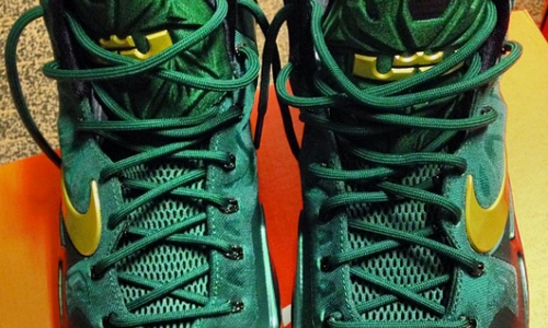 经典的 SVSM詹姆斯高中配色终于在 LeBron 11 上呈现了。采用了深绿色的鞋身,点缀金黄色的 Swoosh 和 LBJ LOGO。 目前这款 PE 版的 SVSM 配色球鞋只为这所高中的校队所穿着。